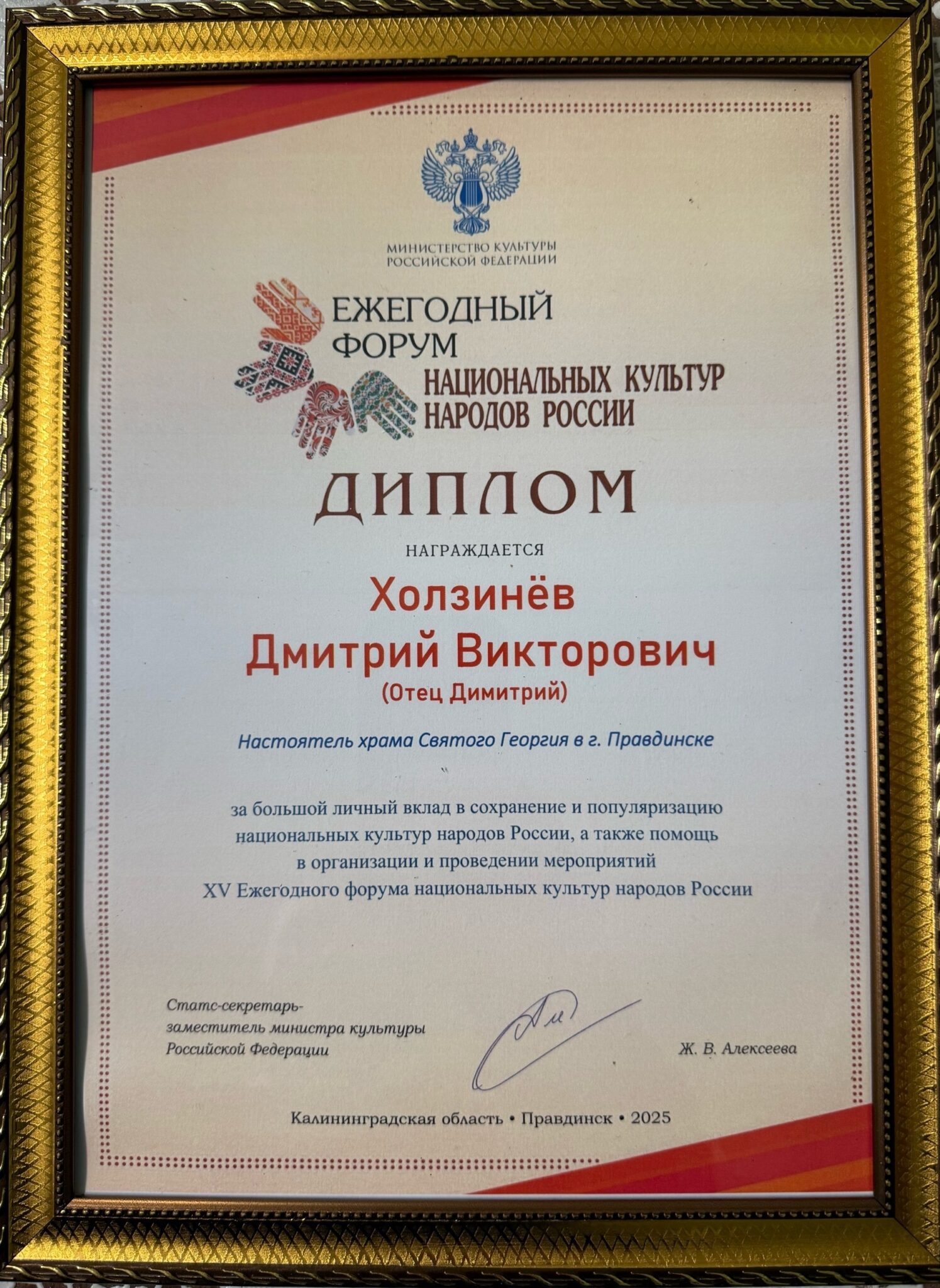 Настоятель храма великомученика Георгия Победоносца иерей Димитрий Холзинев награжден дипломом Ежегодного форума национальных культур народов России, который проходил в этом году в Правдинске, за активное участие в организации и проведении мероприятий форума и большой личный вклад в сохранение и популяризацию национальных культур народов России.