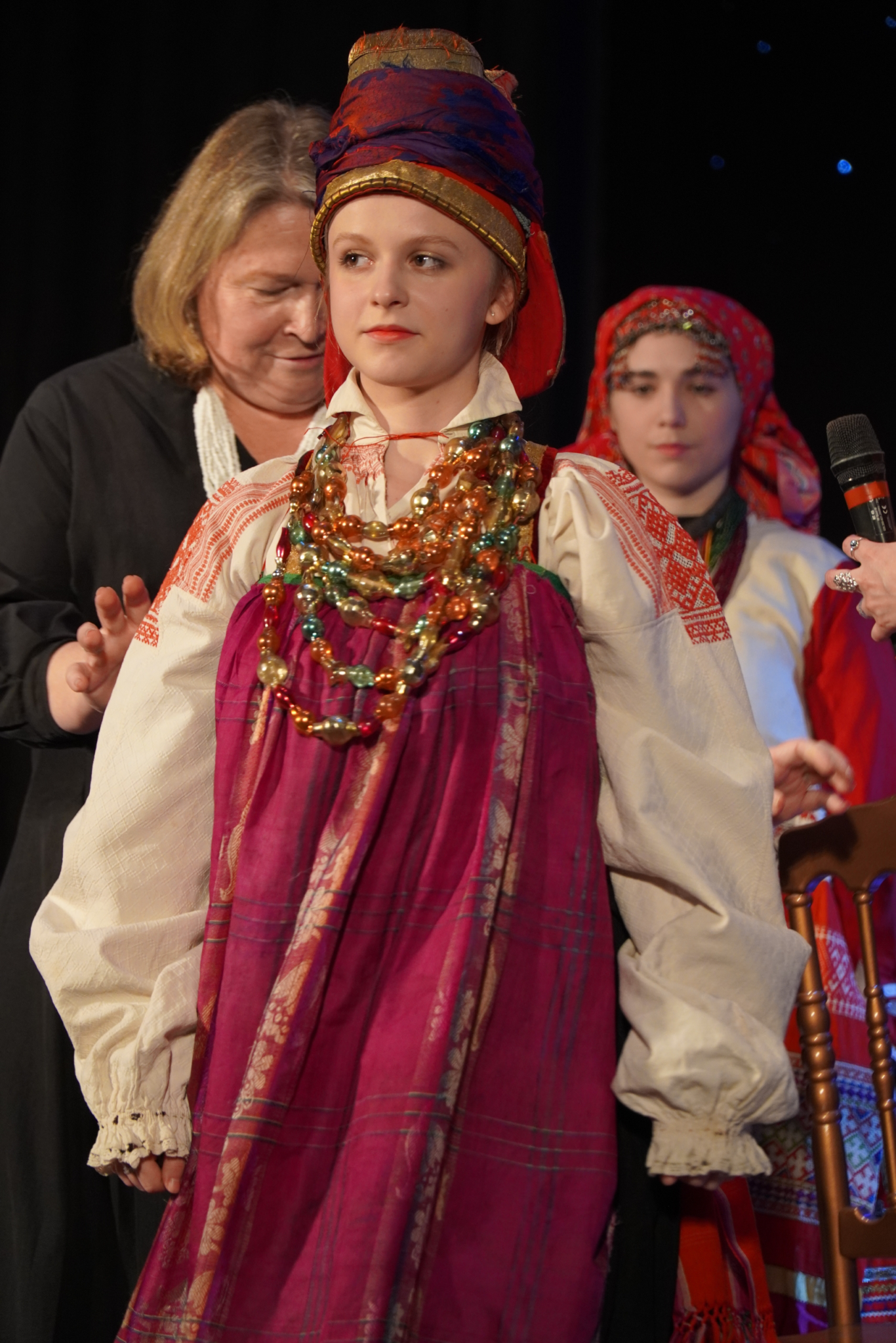 Завершилось пленарное заседание поистине завораживающем действом «Песни русского костюма», которое представила Анна Борисовна Теплова, кандидат педагогических наук, заведующая кафедрой РАЖВиЗ Ильи Глазунова, доцент кафедры МГППУ. Участники чтений, не сходя с места, смогли отправиться в прекрасное путешествие по разным регионам нашей страны, увидев, как живет традиционный русский костюм, какие песни поют люди, которые этот костюм носят. Девушки из фольклорной студии «Горожане», которая функционирует в Москве уже больше 15 лет, преобразились буквально на глазах. Он не только стали моделями для показа коллекции подлинных традиционных народных костюмов, собранных Анной Борисовной за долгие годы экспедиций, но и «озвучили» их с помощью Варвары Котовой, исполнительницы старинной музыки и фольклора, солистки ансамбля древнерусской духовной музыки «Сирин». Они исполнили народные песни, которые никого не оставили равнодушными, ведь народная культура — это прежде всего мировоззрение. Это прежде всего понимание человека. Каков он? Для чего он здесь? И как он этот мир живет?