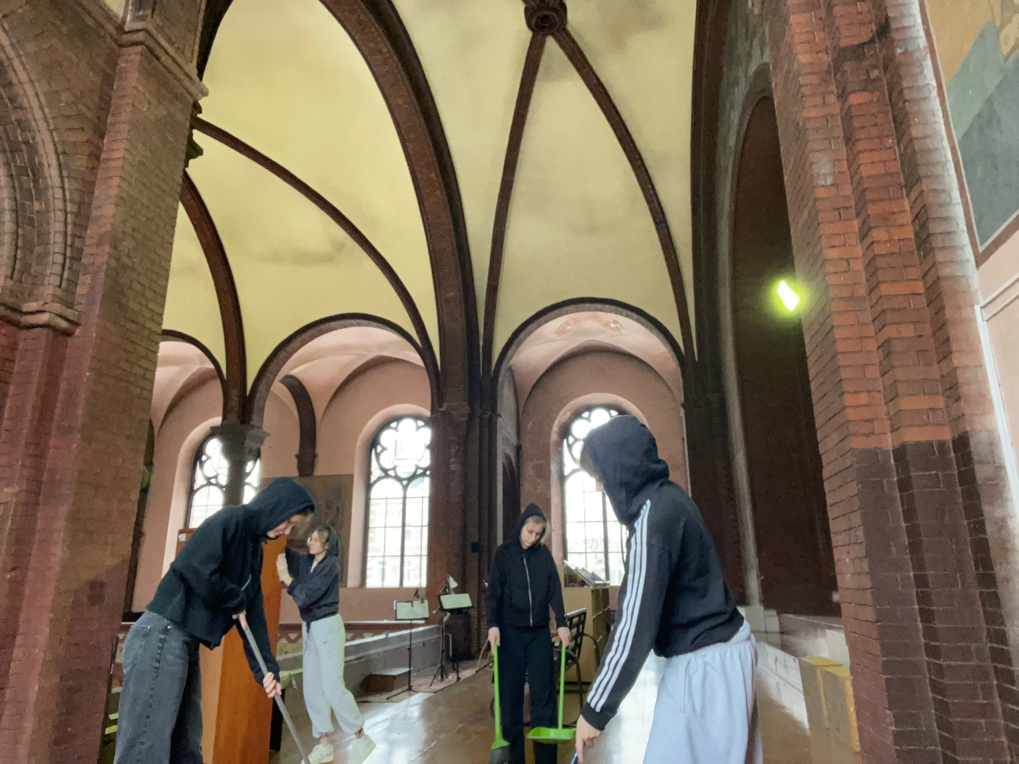 Ребята из добровольческого объединения молодежи снова помогли с уборкой в православном соборе Архангела Михаила города Черняховска.