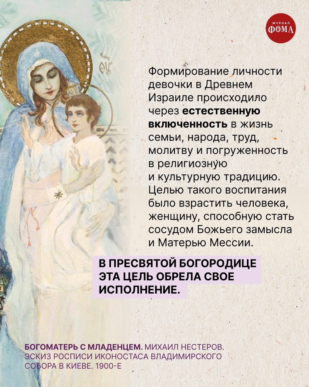 Что происходило с Ней после этого и как проходили Ее детские годы до Благовещения, мы знаем лишь отчасти. Однако, даже учитывая Ее особое пребывание при храме, можно предположить, что во многом Ее воспитание следовало обычным представлениям того времени.