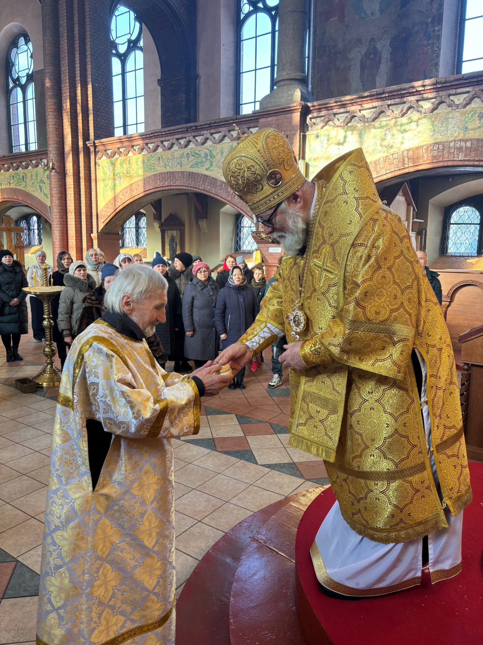 После проповеди епископ Николай поздравил с юбилеем алтарника собора Николая Васильевича Куцаренко.