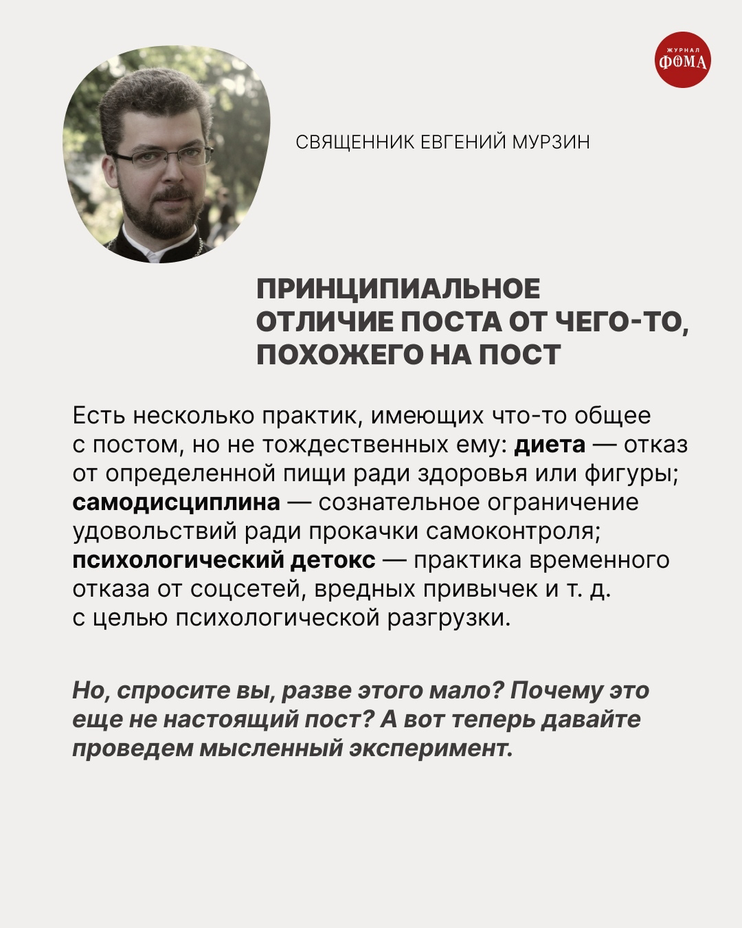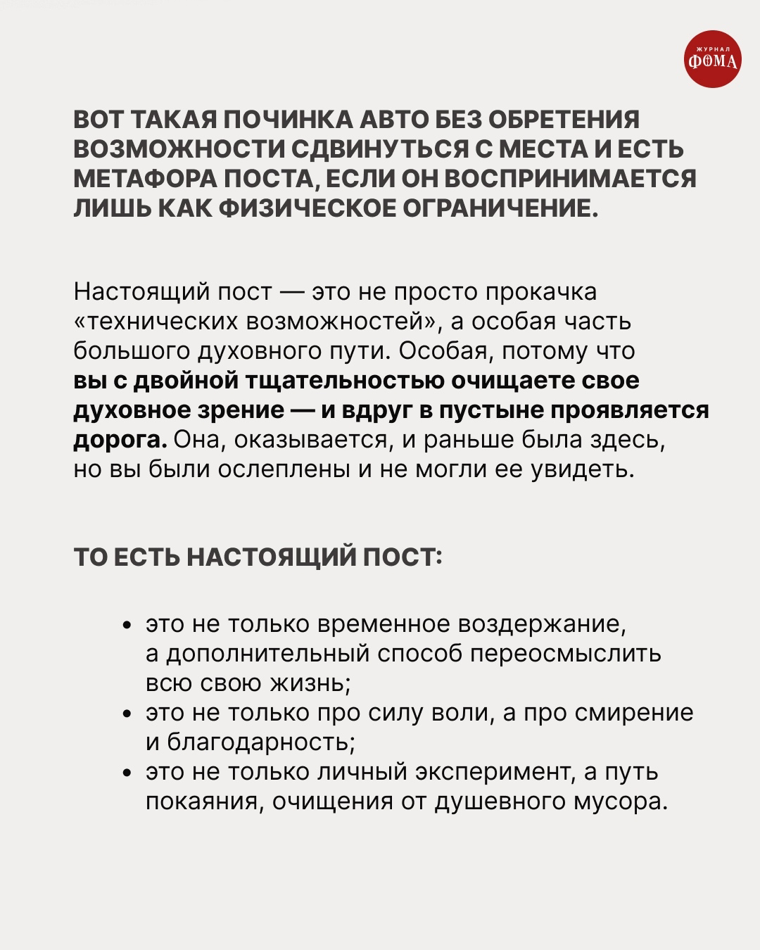 Пост для нашей «физики» — очень полезная вещь (если, конечно, медицинских ограничений нет). Не случайно поэтому его часто воспринимают просто как способ очистить организм, похудеть, потренировать силу воли. А чтобы было легче, к нашим услугам отделы постных продуктов в магазинах и постное меню в ресторанах. Добавить нагрузку в спортзале, витаминно-минеральный комплекс — и вот он очередной «челлендж», для которого созданы вполне комфортные условия. Но можно ли называть это настоящим постом?
