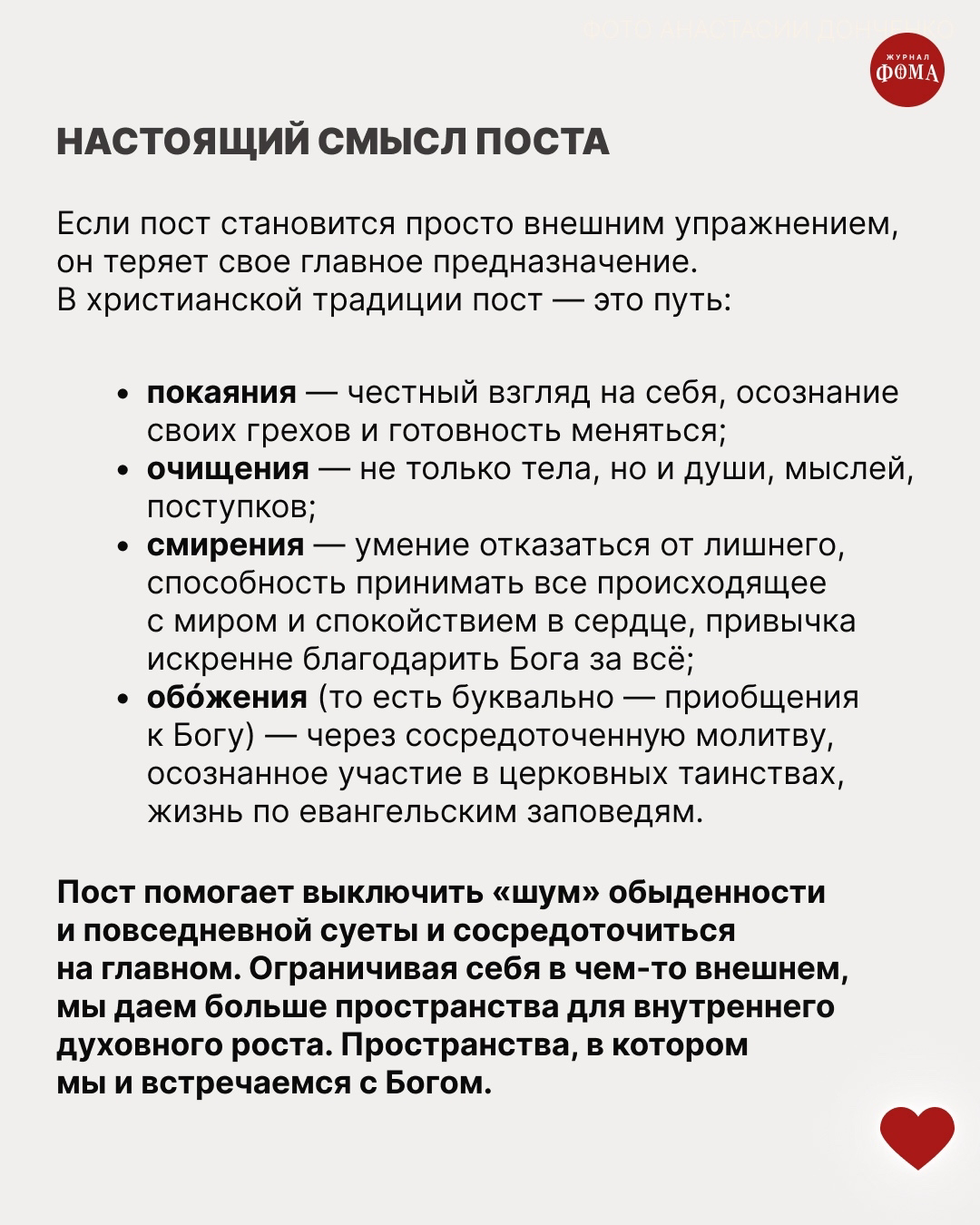 Знаете, вы большой молодец, что решили попробовать. С чего-то надо начинать. Но если вы ограничитесь только едой, то упустите такие духовные сокровища, по сравнению с которыми гастрономический детокс — это до обидного мало. Как получить от поста больше? Рассказывает журнал «Фома».