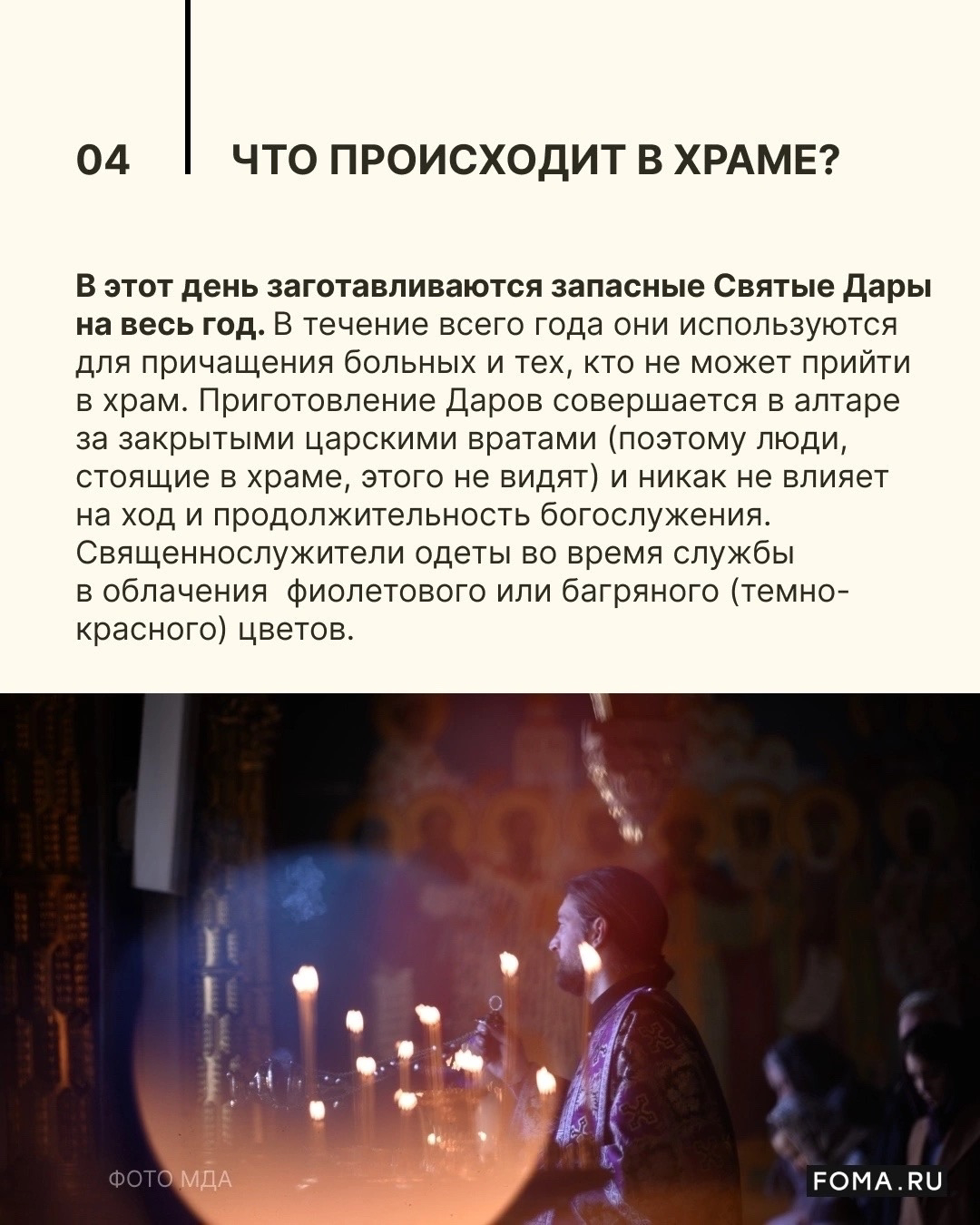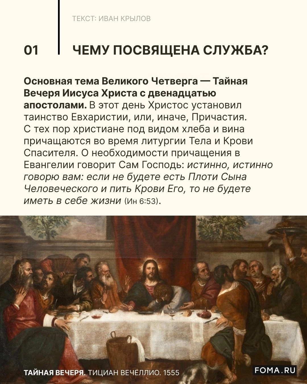 На Тайной Вечере Иисус Христос совершил первую в истории человечества Евхаристию и оставил нам великий дар — причастие Своих Тела и Крови. Об этом событии мы вспоминаем в Великий Четверг. Как проходит служба, которая совершается в этот день в православных храмах? Разбираемся в слайдах журнала «Фома».